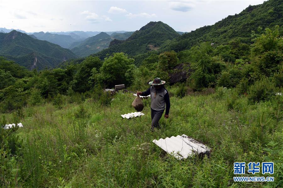 5月10日,在甘肅省隴南市徽縣大河店鎮(zhèn)硬灣村,蜂農(nóng)周仲頤在收蜂。 甘肅省隴南市徽縣大河店鎮(zhèn)硬灣村位于秦巴山區(qū)深處,2017年,在當?shù)卣姆龀窒拢堁吕铣裁垧B(yǎng)殖農(nóng)民專業(yè)合作社成立,蜂農(nóng)們將傳統(tǒng)養(yǎng)蜂技藝和現(xiàn)代加工方式相結合,并通過電商等渠道打開銷路,有效帶動了當?shù)刎毨Т迕衩撠氈赂?。目前整個合作社共有蜂箱2000余個,每箱每年可帶來三四千元的收入。 新華社記者 馬寧 攝