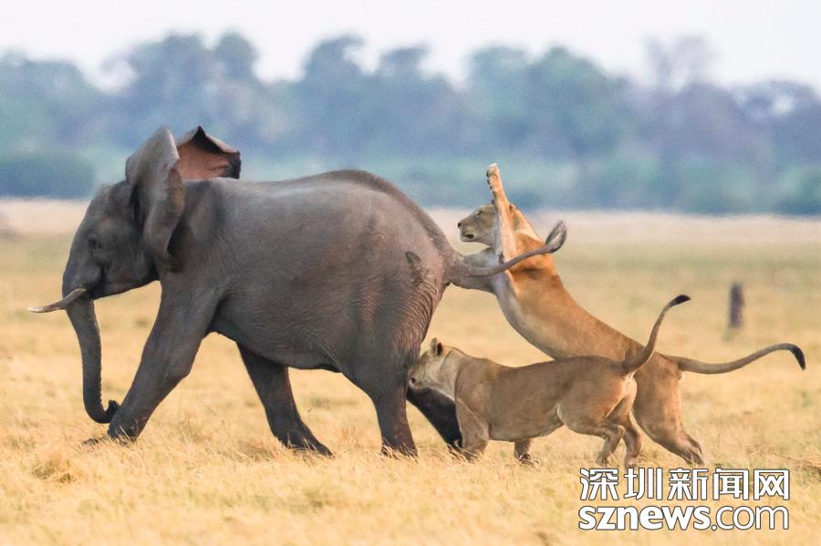 英國攝影師詹姆斯(James Gifford)在博茨瓦納喬貝國家公園拍到一群獅子獵食大象的精彩畫面。在詹姆斯的鏡頭下,一頭母獅跳到了一頭小象的背上想要將其拿下,但僅憑一己之力又不能做到。但當(dāng)母獅的后援抵達(dá)時(shí),象群也趕到了現(xiàn)場(chǎng)。最終,小象回到了象群中獲得庇護(hù),而獅群也不得不悻悻離去。