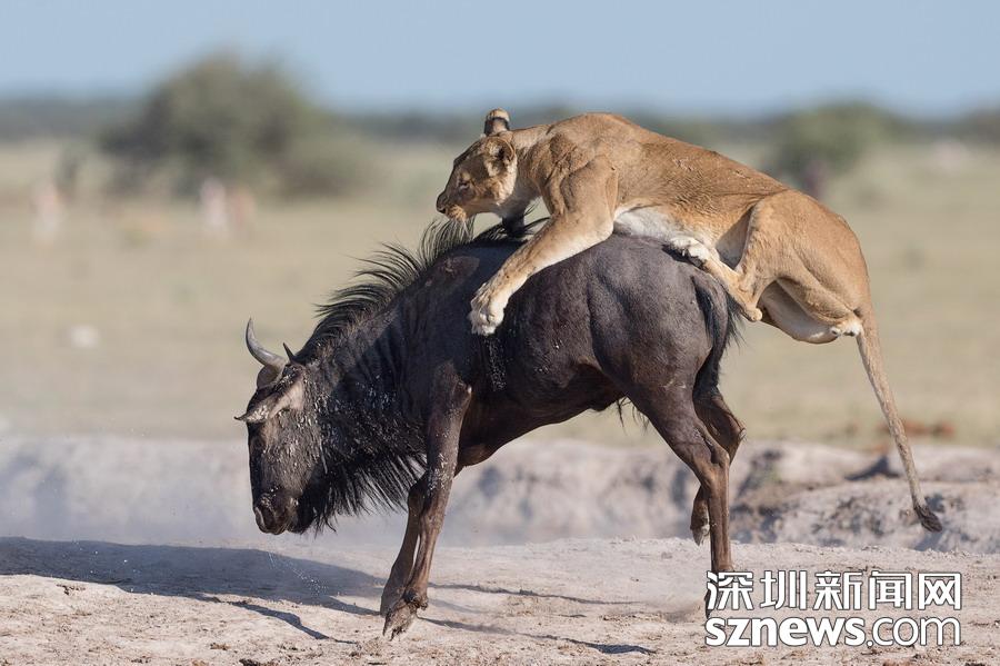 英國(guó)攝影師蘇-莫里斯(Sue Morri)在博茨瓦納Nxai Pan國(guó)家公園游玩,目睹了一場(chǎng)兇惡母獅獵食角馬的畫(huà)面。母獅甚至攀到了角馬背上,想要牢牢遏制住到手的“美餐”。強(qiáng)壯的角馬努力地與母獅抗?fàn)帲吡ο胍W∽约旱男悦?,但最終還是不敵母獅被拿下,最后成了母獅孩子們的盤(pán)中餐。