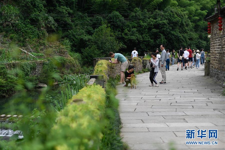 游客在石舍村游覽(5月25日攝)。 石舍村是浙江省桐廬縣富春江鄉(xiāng)村慢生活體驗區(qū)中的三個村落之一,位置偏僻,依溪而居,風景秀美。近年來,石舍村結(jié)合古建筑保護工作,在清潔、美化村莊的基礎(chǔ)上,對一些廢棄古建筑進行修繕,引入咖啡館、民宿等文化創(chuàng)意類項目,優(yōu)良的生態(tài)環(huán)境和濃郁的文化氛圍吸引大批游客前來體驗,小山村走上了一條發(fā)展美麗經(jīng)濟之路。2018年,石舍村接待游客10萬8千余人次,旅游經(jīng)營凈收入1260余萬元。 新華社記者 黃宗治 攝