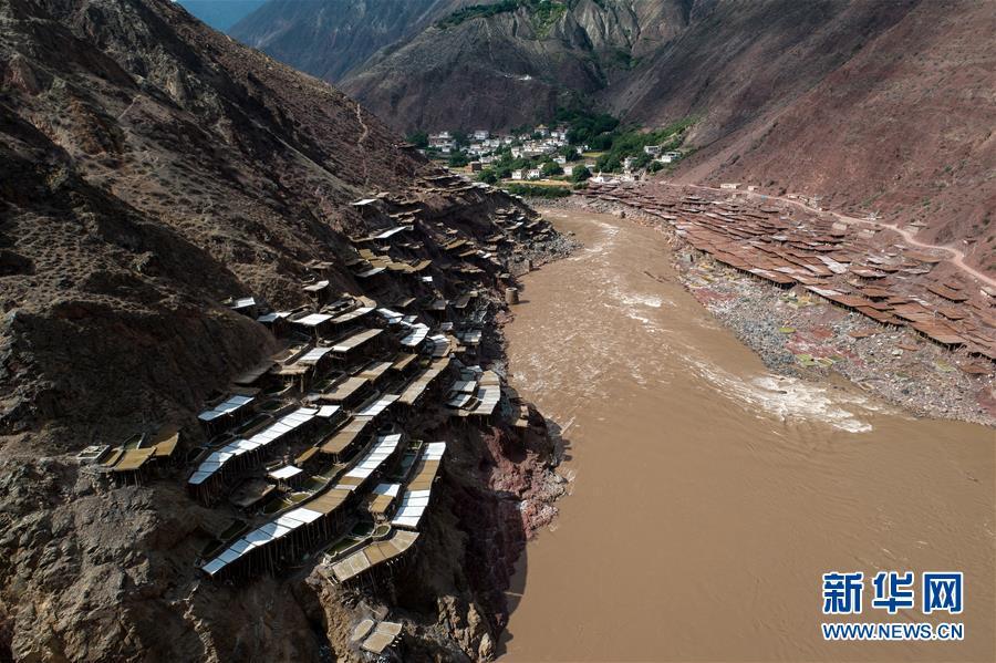 這是西藏芒康縣納西民族鄉(xiāng)的古鹽田景觀(5月22日無(wú)人機(jī)拍攝)。 位于西藏昌都芒康縣瀾滄江畔的古鹽田,至今仍保持最原始的手工曬鹽方式。據(jù)史料記載,唐朝時(shí)期當(dāng)?shù)鼐烷_(kāi)始曬鹽。鹽田在瀾滄江兩岸依山而建,由多根木柱搭架,架上用透水性強(qiáng)的泥土鋪成平面夯實(shí),當(dāng)?shù)鼐用駨臑憸娼系柠}井、鹽池中取出鹵水倒入鹽田,經(jīng)陽(yáng)光蒸曬、風(fēng)干,結(jié)晶成鹽。遠(yuǎn)遠(yuǎn)望去,鹽田錯(cuò)落有致,田中鹵水宛若鏡面,形成壯麗奇觀。 新華社記者 李鑫 攝
