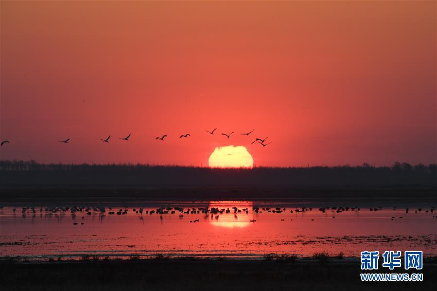 在吉林莫莫格國(guó)家級(jí)自然保護(hù)區(qū),一群白鶴從濕地上空飛過(guò)(4月11日攝)。 新華社記者 張楠 攝