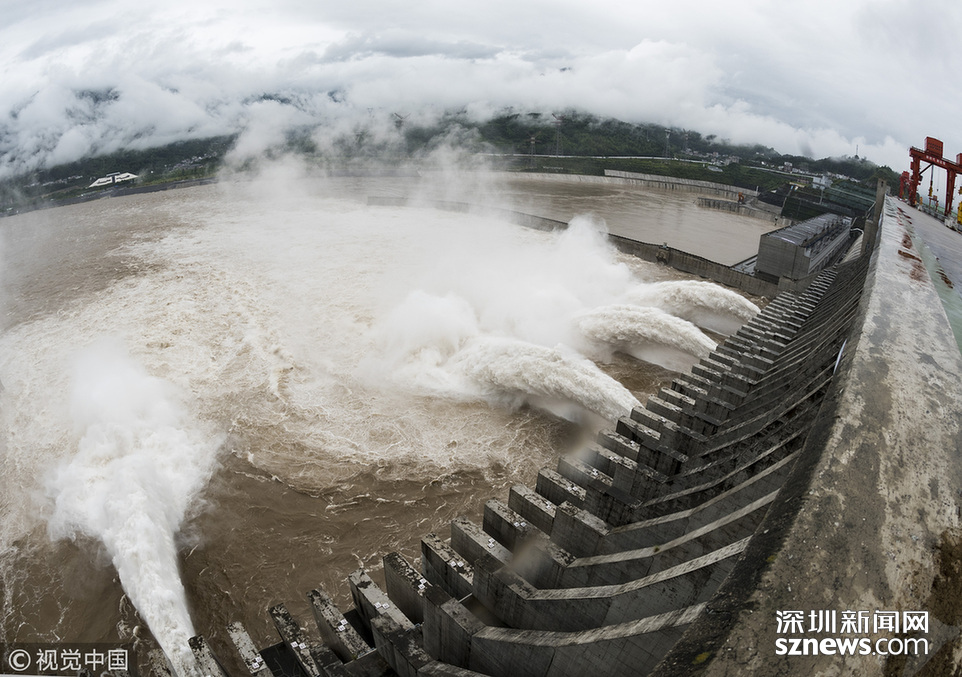 2018年7月5日,湖北宜昌,江水通過三峽大壩泄洪深孔下泄。