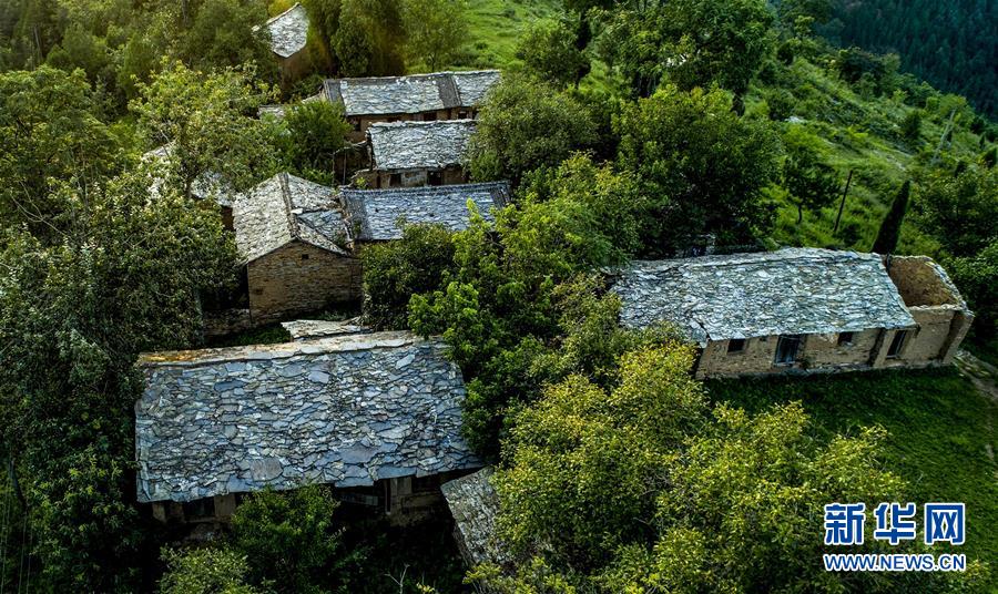 掩映在大山之中的石板房古村落,人去房空(8月7日無(wú)人機(jī)拍攝)。 新華社記者陶明攝