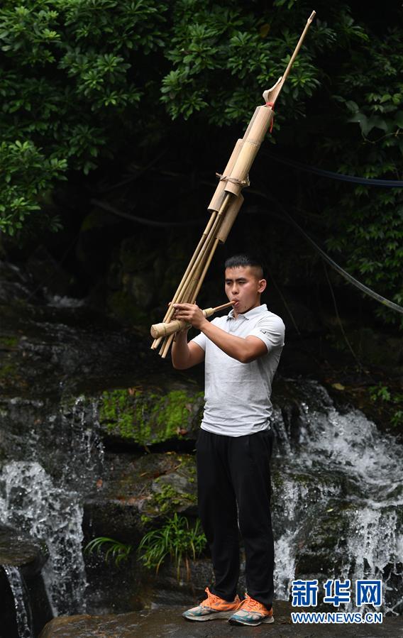 5月30日,在融水苗族自治縣安太鄉(xiāng)小桑村青山屯,杜信文在家門(mén)外試吹一把剛剛制作完成的蘆笙。 新華社記者 陸波岸 攝