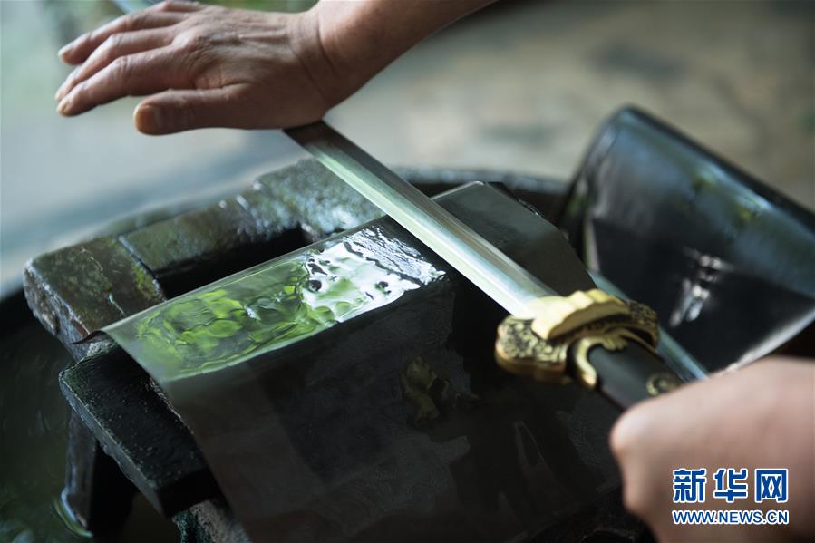 5月21日,鄭國(guó)榮在“古越劍鋪”打井水準(zhǔn)備為寶劍淬火。他說(shuō)淬火用的水很重要,正是看中了這口井他才把工作室設(shè)在這里。 新華社記者 翁忻旸 攝