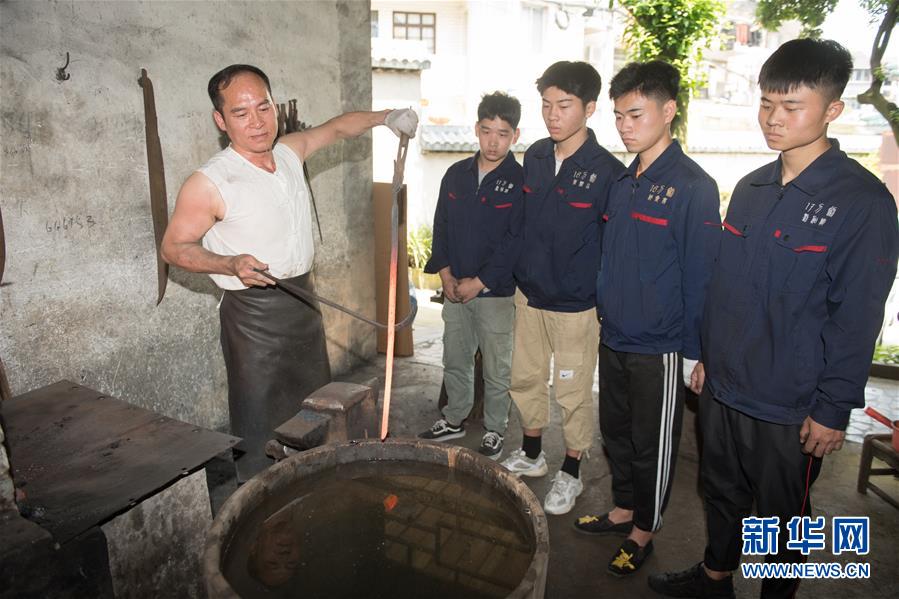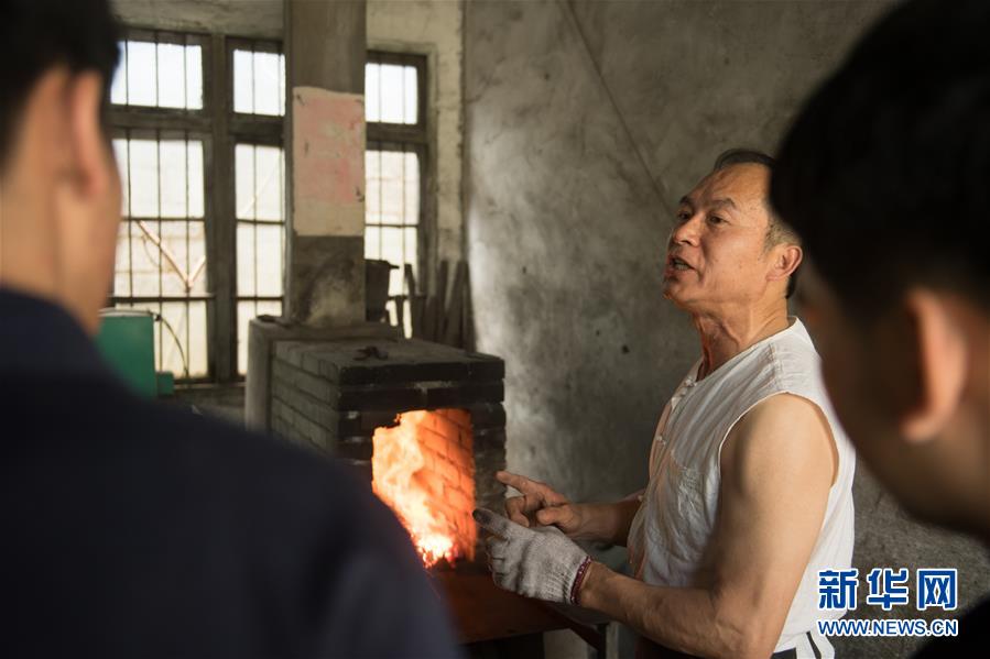 5月21日,鄭國(guó)榮在“古越劍鋪”向徒弟們傳授寶劍淬火技藝。 新華社記者 翁忻旸 攝