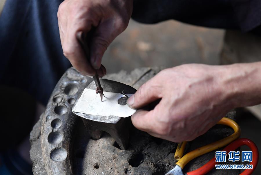 5月29日,在廣西融水苗族自治縣融水鎮(zhèn),銀匠陳四先在打造苗族銀飾。