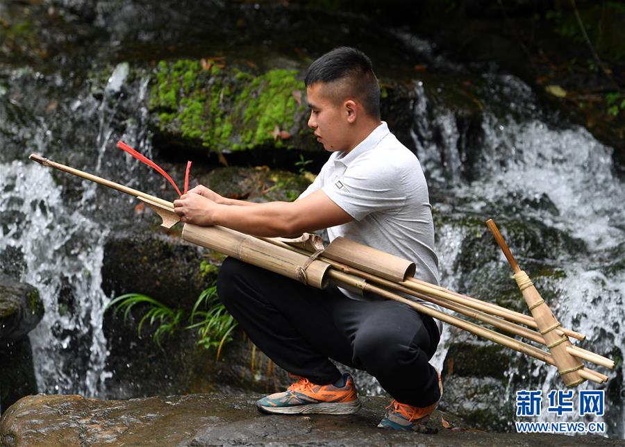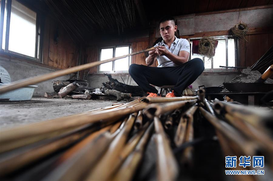 5月30日,在融水苗族自治縣安太鄉(xiāng)小桑村青山屯,杜信文在挑選熏干的竹子準(zhǔn)備做蘆笙。