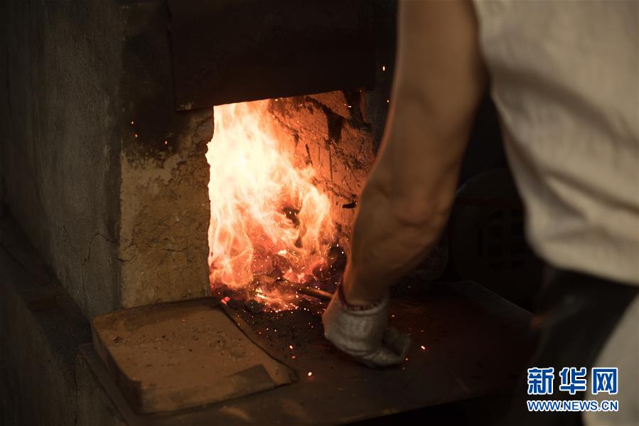 5月21日,鄭國(guó)榮的徒弟們?cè)凇肮旁絼︿仭睂W(xué)習(xí)寶劍鍛打技藝。 新華社記者 翁忻旸 攝