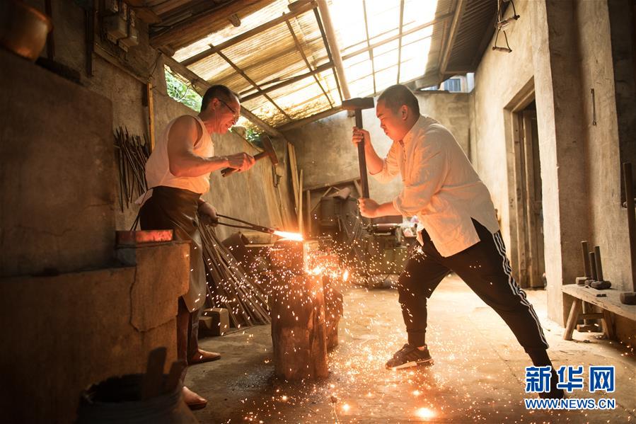 5月21日,鄭國榮(左)和兒子在“古越劍鋪”鍛打坯料。 新華社記者 翁忻旸 攝