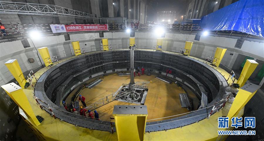 烏東德水電站左岸地下電站主廠房?jī)?nèi)的6號(hào)機(jī)組正在建設(shè)中(5月30日攝)。 新華社記者陳曄華攝