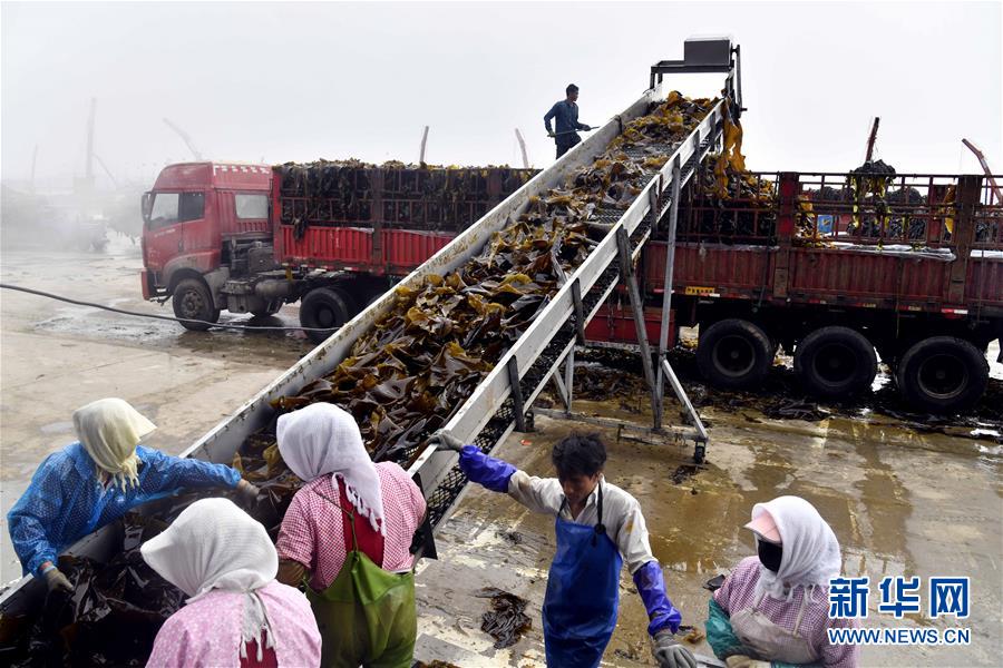 6月5日,在榮成市尋山街道青魚灘村,漁民在加工剛收獲的海帶。 近日,山東省榮成市迎來海帶收獲季。據(jù)悉,榮成市海帶養(yǎng)殖面積14.5萬畝,年產(chǎn)海帶43.3萬噸以上。 新華社記者郭緒雷攝