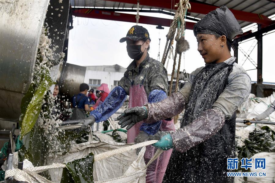 4月10日,霞浦縣長春鎮(zhèn)埕塢村一家海帶加工廠內(nèi),工人在搬運剛收獲的海帶。近日,福建省寧德市霞浦縣30余萬畝養(yǎng)殖海帶進入收獲季節(jié),當(dāng)?shù)仞B(yǎng)殖戶搶抓晴好天氣,收獲海帶。海帶養(yǎng)殖是霞浦縣群眾增收致富的支柱產(chǎn)業(yè)。2018年該縣海帶產(chǎn)量14萬余噸。新華社記者 姜克紅 攝