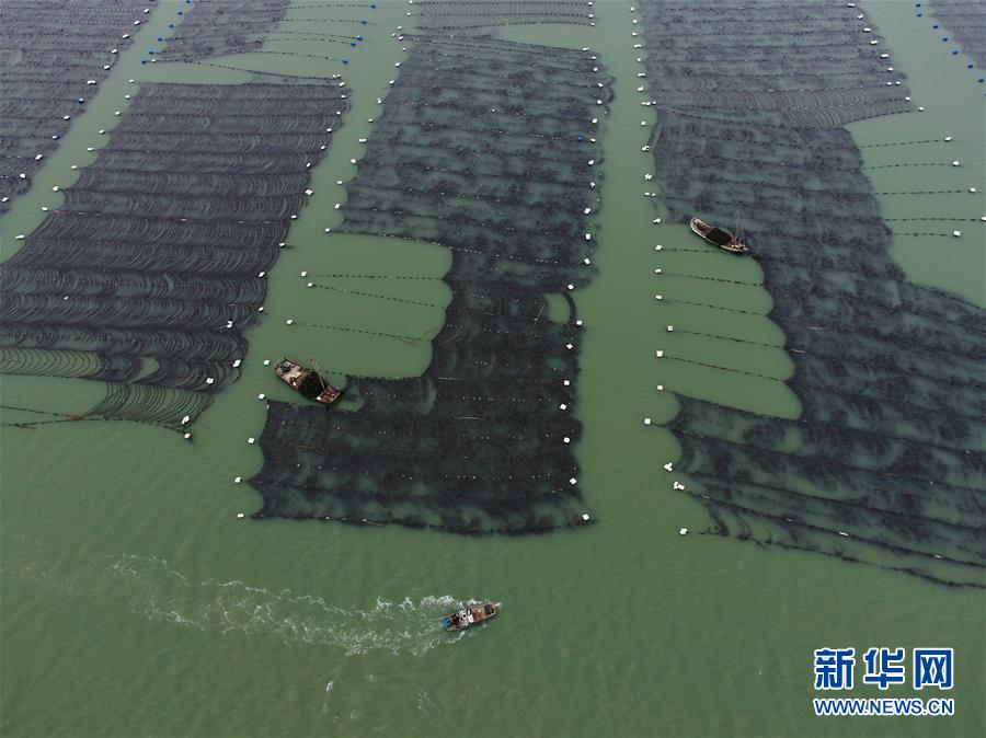 4月10日,霞浦縣長春鎮(zhèn)海域,海帶養(yǎng)殖戶在用船只收獲海帶(無人機拍攝)。近日,福建省寧德市霞浦縣30余萬畝養(yǎng)殖海帶進入收獲季節(jié),當地養(yǎng)殖戶搶抓晴好天氣,收獲海帶。海帶養(yǎng)殖是霞浦縣群眾增收致富的支柱產業(yè)。2018年該縣海帶產量14萬余噸。新華社記者 姜克紅 攝