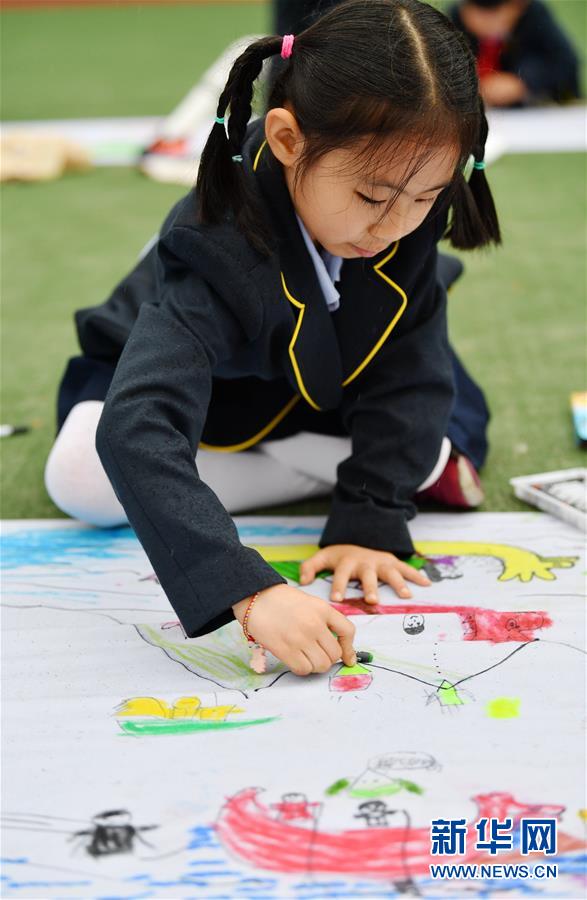 6月5日,陜西師范大學(xué)附屬小學(xué)的學(xué)生在長(zhǎng)卷上畫龍舟。