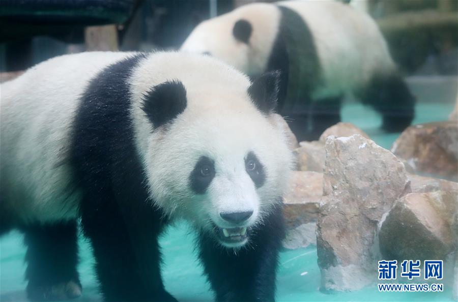 6月18日,大熊貓“和風(fēng)”(前)透過玻璃幕墻向外張望。 當(dāng)日,來自四川的大熊貓兄弟“和風(fēng)”與“星光”飛抵上海,正式開始了在上海動物園為期三年的生活。為迎接這對“風(fēng)光兄弟”,上海動物園將原有的大熊貓館擴建并裝修一新,空調(diào)、水池、游樂場以及竹葉儲存間等配置齊全。 新華社記者 方喆 攝