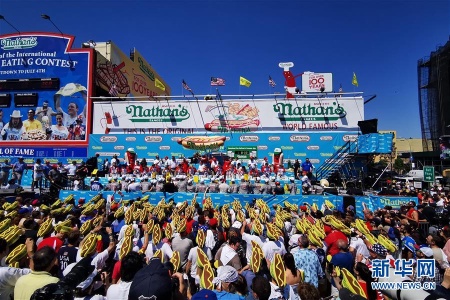 7月4日,在美國紐約康尼島,人們觀看吃熱狗大賽。 當(dāng)日,美國紐約康尼島舉行一年一度的吃熱狗大賽。在男子組比賽中,來自加州的喬伊·切斯特納特10分鐘內(nèi)吃下71個熱狗衛(wèi)冕成功。在女子組比賽中,三木須藤10分鐘內(nèi)吃下31個熱狗,連續(xù)第六次贏得冠軍。 新華社記者 李木子 攝