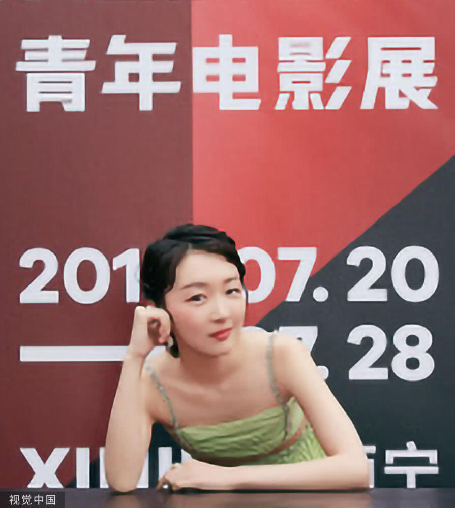 周冬雨穿牛油果綠吊帶裙清新可人,趴桌臺俏皮擺拍落落大方;圖片來源:視覺中國