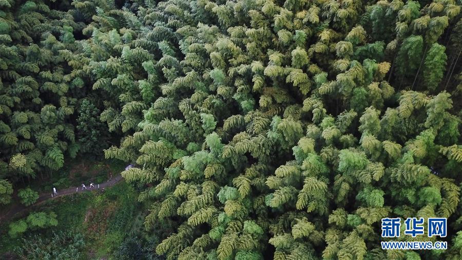 8月3日,游客行走在木坑竹海景區(qū)的小路上(無人機(jī)拍攝)。夏日,安徽省黃山市黟縣的木坑竹海景區(qū)風(fēng)景優(yōu)美,吸引不少游客前來休閑避暑。新華社記者張端攝