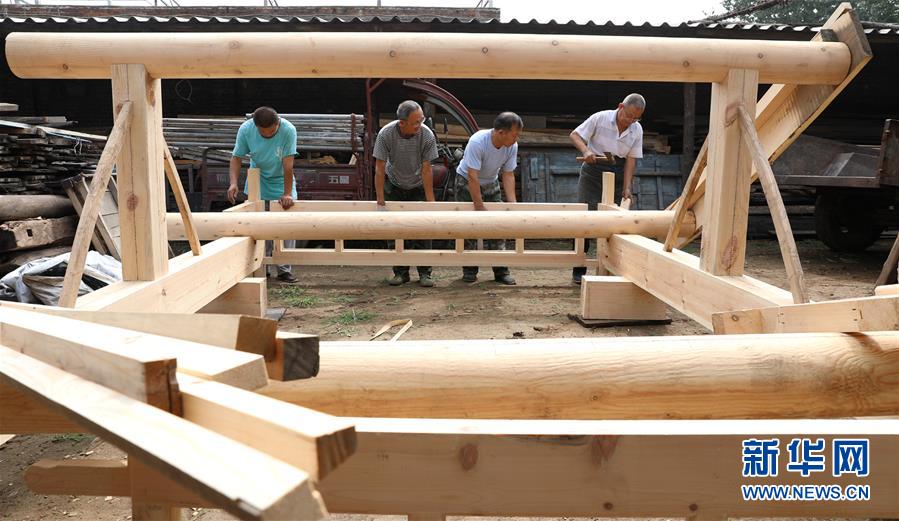 8月7日,在石家莊市井陘礦區(qū)橫西村,韓保元(右一)和工作人員在制作房架結(jié)構(gòu)。