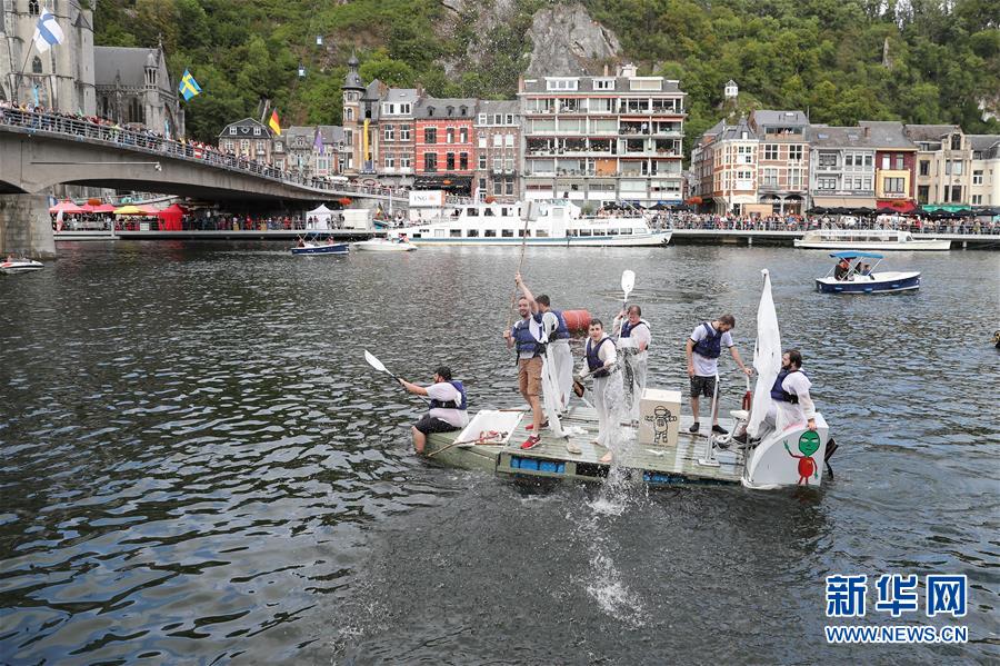 8月15日,在比利時南部小城迪南的默茲河上,人們參加“浴缸劃船節(jié)”的表演。