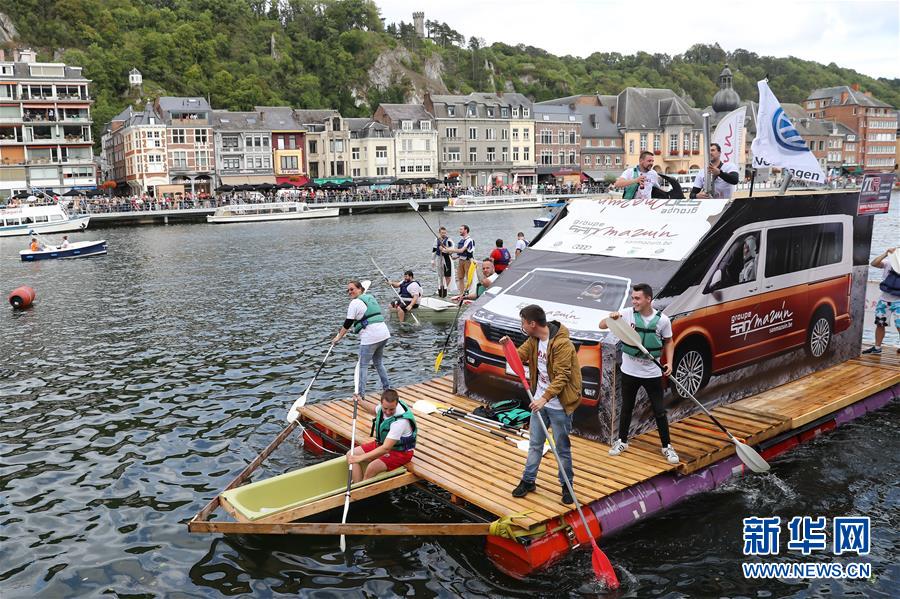 8月15日,在比利時南部小城迪南的默茲河上,人們參加“浴缸劃船節(jié)”的表演。 新華社記者 張鋮 攝