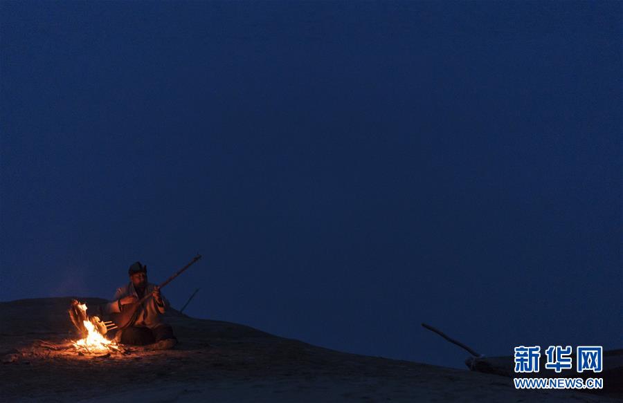 在羅布人村寨,阿木東·艾不東在沙漠里的一處海子旁彈奏樂器,等待烤魚烤熟(4月11日攝)。新華社記者 費(fèi)茂華 攝