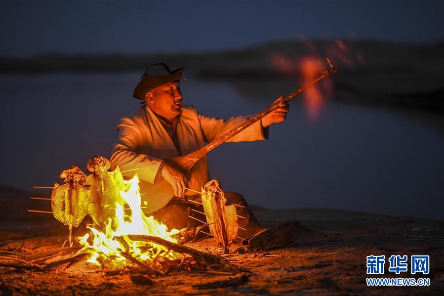 在羅布人村寨,阿木東·艾不東在沙漠里的一處海子旁彈奏樂(lè)器,等待烤魚烤熟(4月11日攝)。新華社記者 趙戈 攝