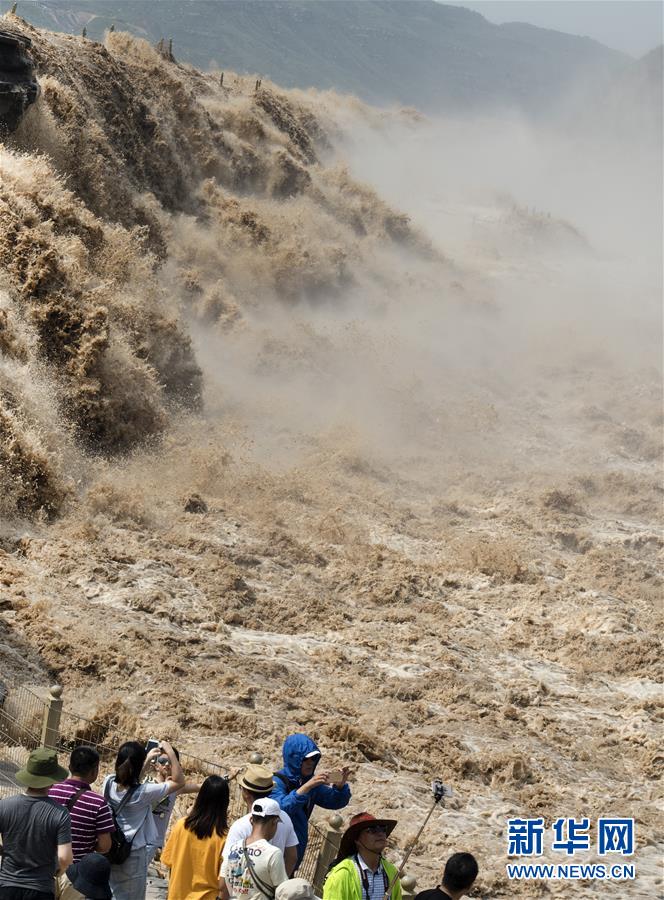 7月19日,游客在陜西境內(nèi)的壺口瀑布群前留影。