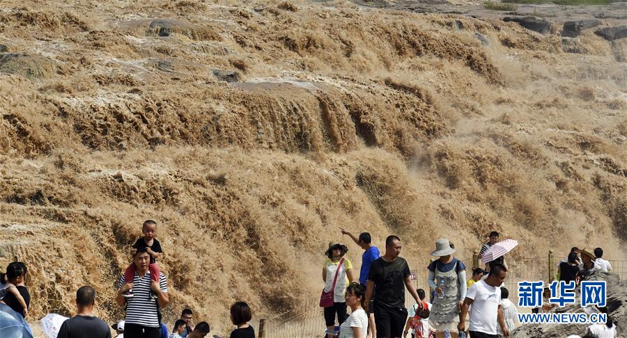 7月19日,游客在山西境內(nèi)的壺口瀑布群前留影。 新華社記者陶明 攝
