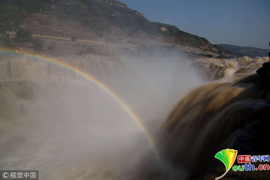 5月31日,山西臨汾奔騰咆哮的黃河壺口瀑布吸引游客。