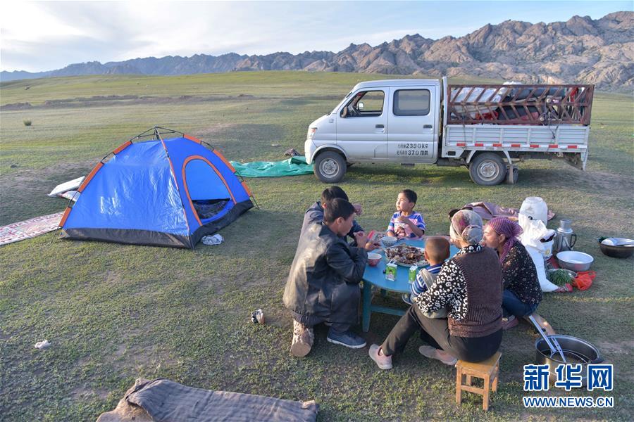 在新疆阿勒泰地區(qū)福海縣,牧民在轉(zhuǎn)場途中吃晚餐(6月5日攝)。新華社記者丁磊攝