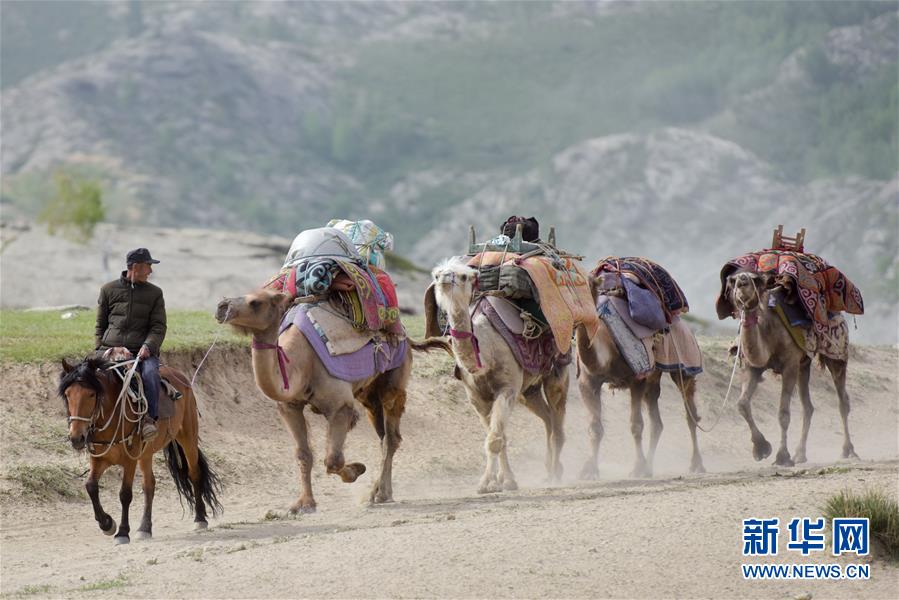 6月6日,新疆阿勒泰地區(qū)福??h牧民帶著駝隊(duì)行進(jìn)在轉(zhuǎn)場途中。 新華社記者 丁磊 攝
