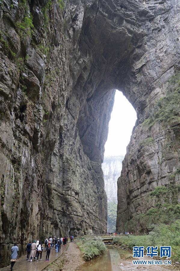 游客在天生三橋景區(qū)內的青龍橋景點游覽(3月27日攝)。 新華社記者劉潺攝