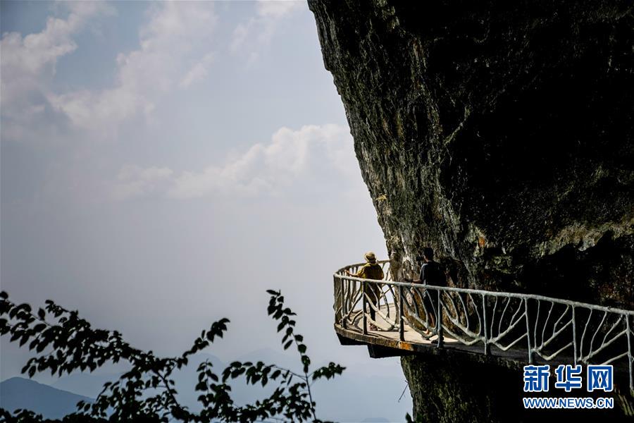 游客在重慶金佛山風(fēng)景區(qū)內(nèi)的絕壁棧道上游覽體驗(yàn)(8月20日攝)。 新華社記者 劉潺 攝