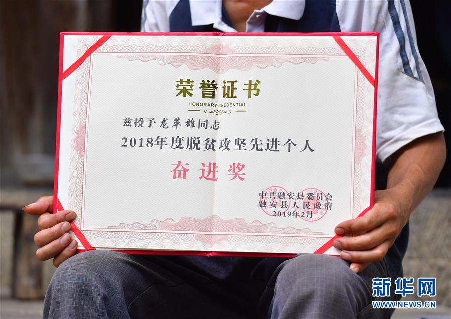 龍革雄在展示榮譽證書(8月16日攝)。新華社記者 黃孝邦 攝