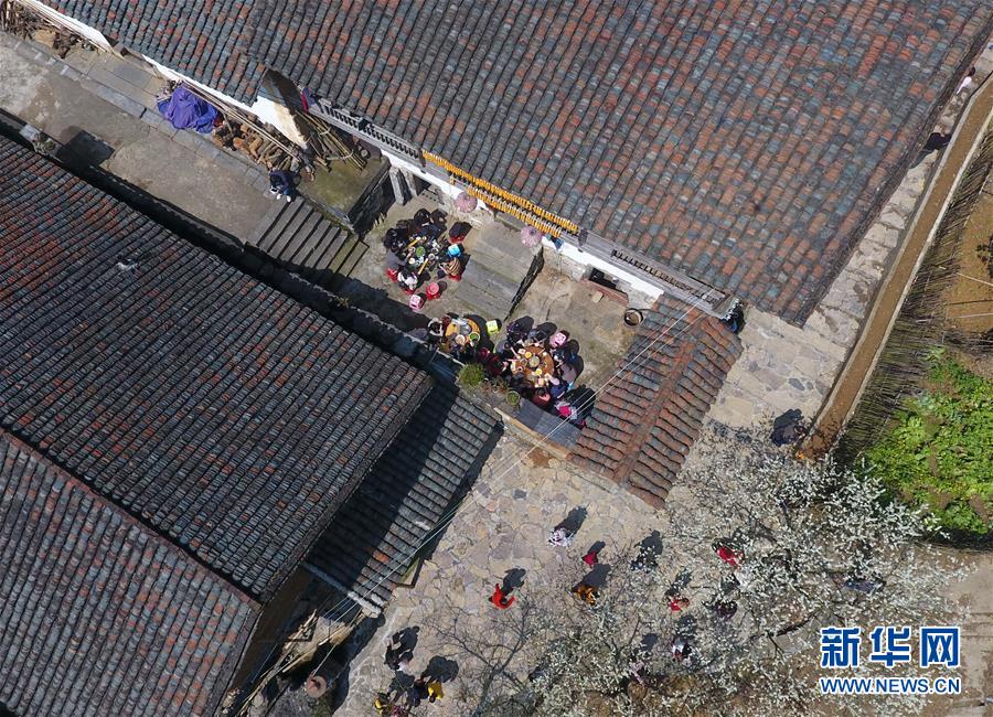 游客在龍革雄家的院子里吃午飯 (3月3日無人機拍攝)。 新華社記者 黃孝邦 攝