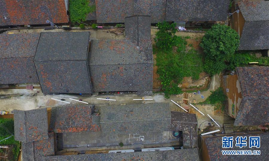 龍革雄和村民一起搬運雨污分流工程水管(2017年8月18日無人機拍攝)。新華社記者 黃孝邦 攝