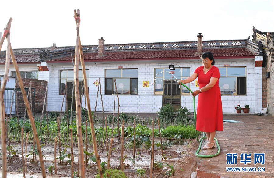 東坪村村民郭金蘭在新房的院子里澆水(6月13日攝)。 新華社記者 楊晨光 攝