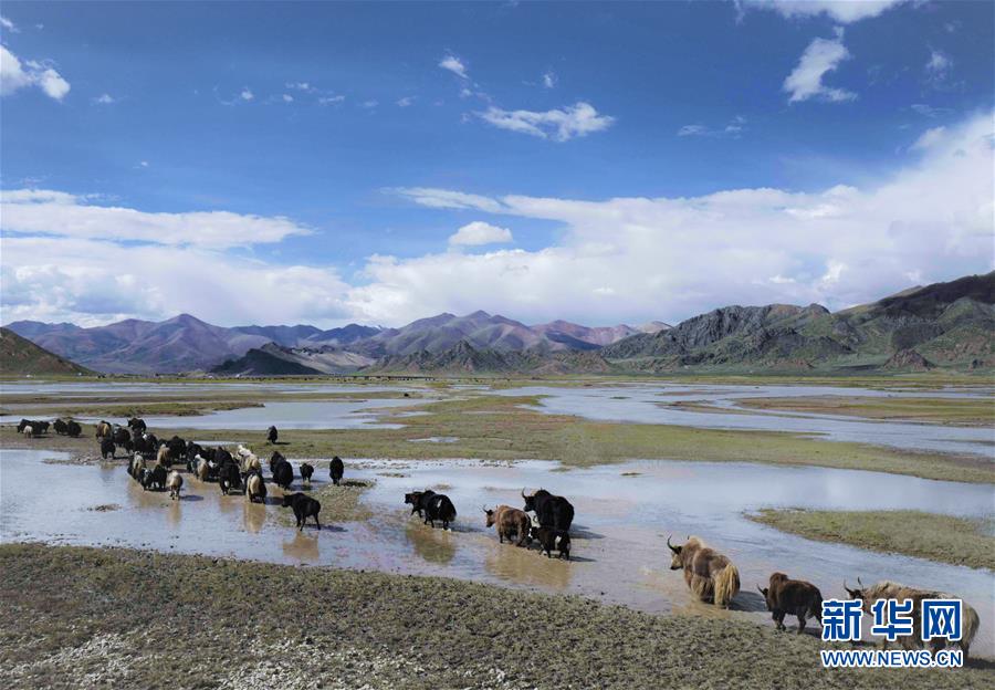 一群牦牛走過(guò)藏北濕地(2018年9月7日攝)。新華社記者 普布扎西 攝