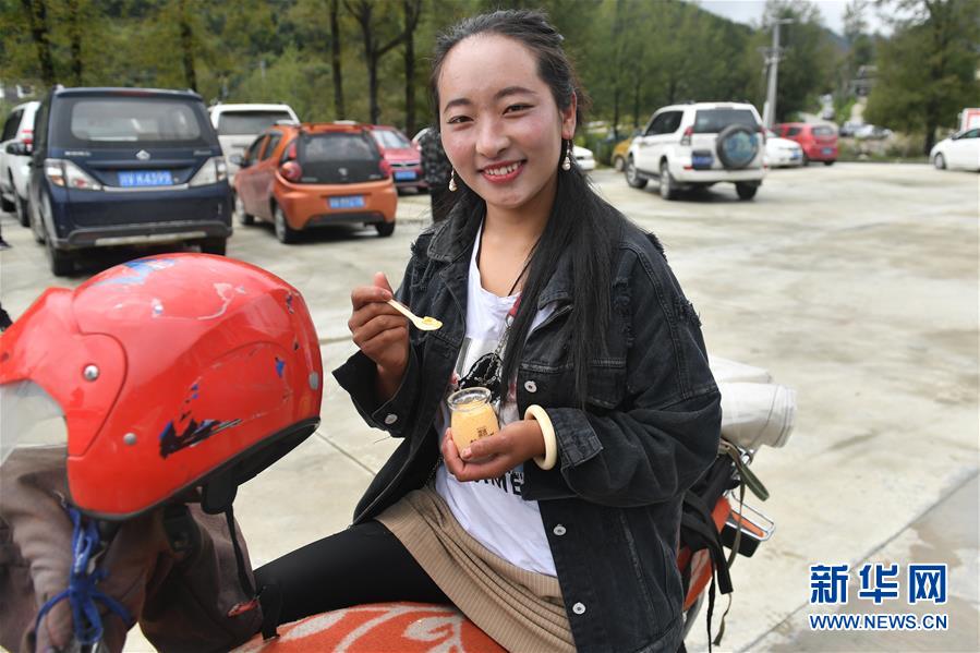 9月8日,在四川省康定市一家牦牛乳制品公司的工廠,藏族姑娘根翁品嘗牦牛奶制成的冰激凌。新華社記者孫瑞博攝