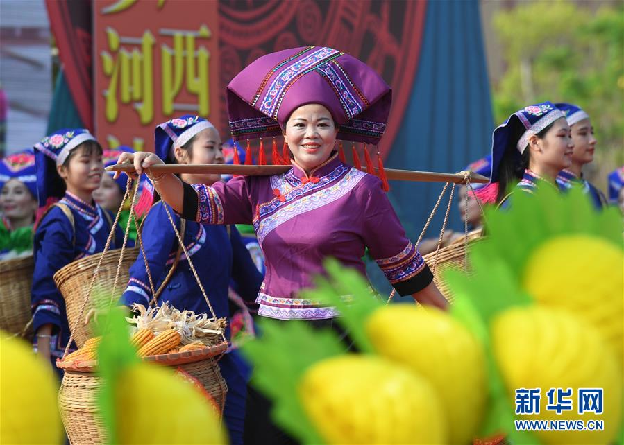 9月17日,廣西都安瑤族自治縣密洛陀文化公園廣場(chǎng),演員在啟動(dòng)儀式上表演節(jié)目《在希望的田野上》。 當(dāng)日,2019年廣西慶?!爸袊?guó)農(nóng)民豐收節(jié)”啟動(dòng)儀式暨河池市“慶豐收·促脫貧”系列活動(dòng)在都安瑤族自治縣舉行,各族群眾和來(lái)賓一起載歌載舞歡慶豐收節(jié)。 新華社記者 陸波岸 攝