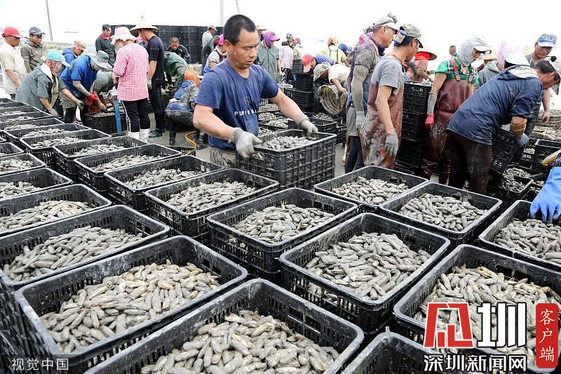 2019年7月9日,漁民們在江蘇連云港沿海地區(qū)海邊的灘涂上將剛收獲的海蟶運(yùn)送上岸裝箱外運(yùn)。