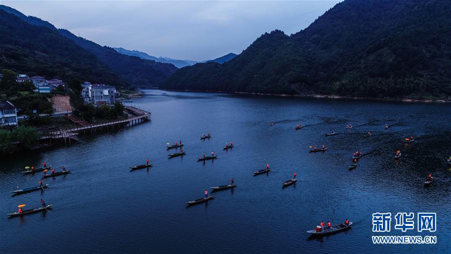 9月25日,在宋村鄉(xiāng)云源港的水面上,漁民劃著漁船,船頭點亮漁燈,構成一幅“漁舟唱晚、萬家燈火”的美麗圖景,與沿湖民宿群落交相輝映(無人機拍攝)。 新華社記者 徐昱 攝