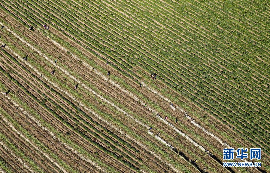 9月30日,寧夏吳忠市紅寺堡區(qū)馬渠生態(tài)移民安置區(qū)的農(nóng)民在蘿卜地里勞作(無人機拍攝)。 新華社記者 馮開華 攝