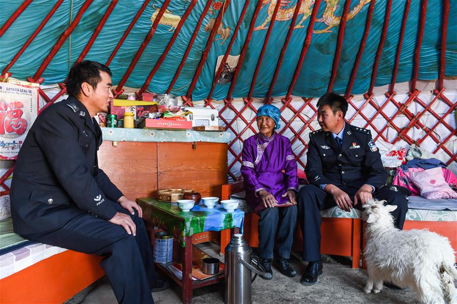 9月27日,內(nèi)蒙古自治區(qū)額濟(jì)納旗算井子邊境派出所民警走訪看望牧民蘇伊勒圖雅(中)。新華社記者劉磊攝