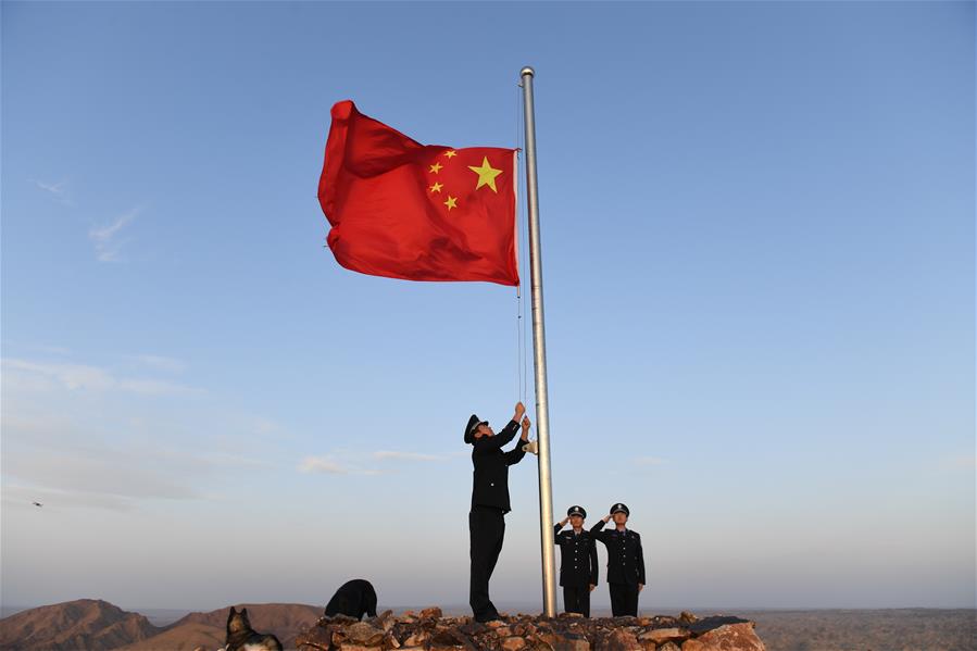 9月27日,內(nèi)蒙古自治區(qū)額濟(jì)納旗算井子邊境派出所民警在大紅山上舉行升國旗儀式。新華社記者劉磊攝