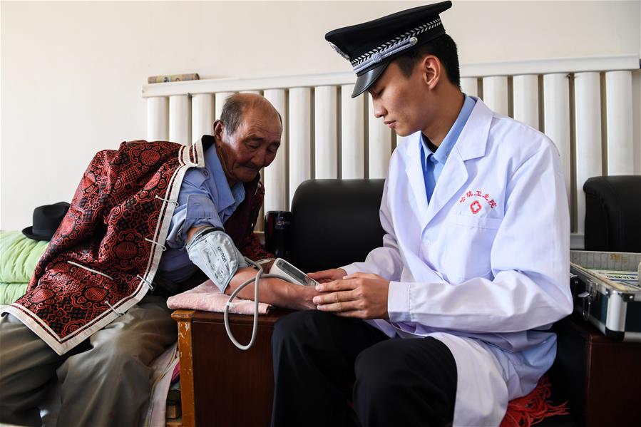 9月25日,內(nèi)蒙古自治區(qū)額濟(jì)納旗算井子邊境派出所的衛(wèi)生員陳亞偉(右)給牧民黨德爾進(jìn)行體檢。新華社記者劉磊攝