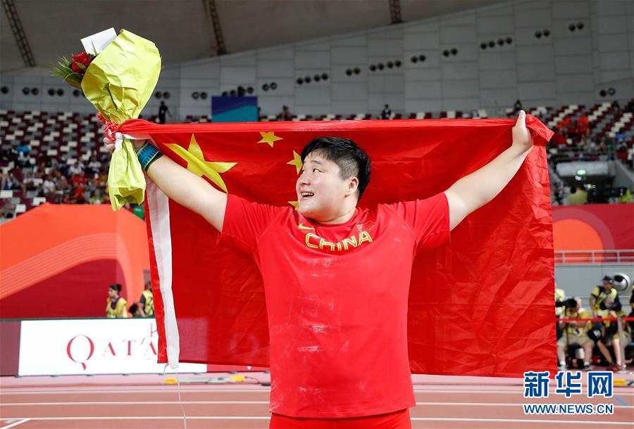 當日,在卡塔爾多哈舉行的2019國際田聯(lián)世界田徑錦標賽女子鉛球決賽中,衛(wèi)冕冠軍、中國選手鞏立姣以19米55的成績奪得冠軍。 新華社記者王麗莉攝